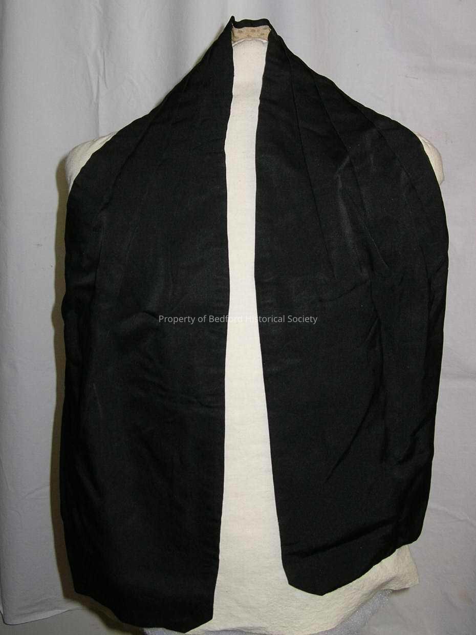 Black satin ascot scarf, label: H.V. Keep Shirt Co. 1147 Broadway and Broad Exchange Bldg, NY