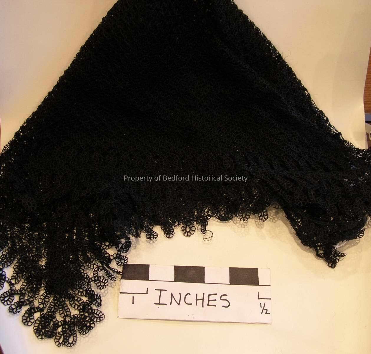 Black lace scarf "fascinator" worn by Julia Banks Hoyt (1835-1927) "over her head everyday for dropping in on neighbors"
