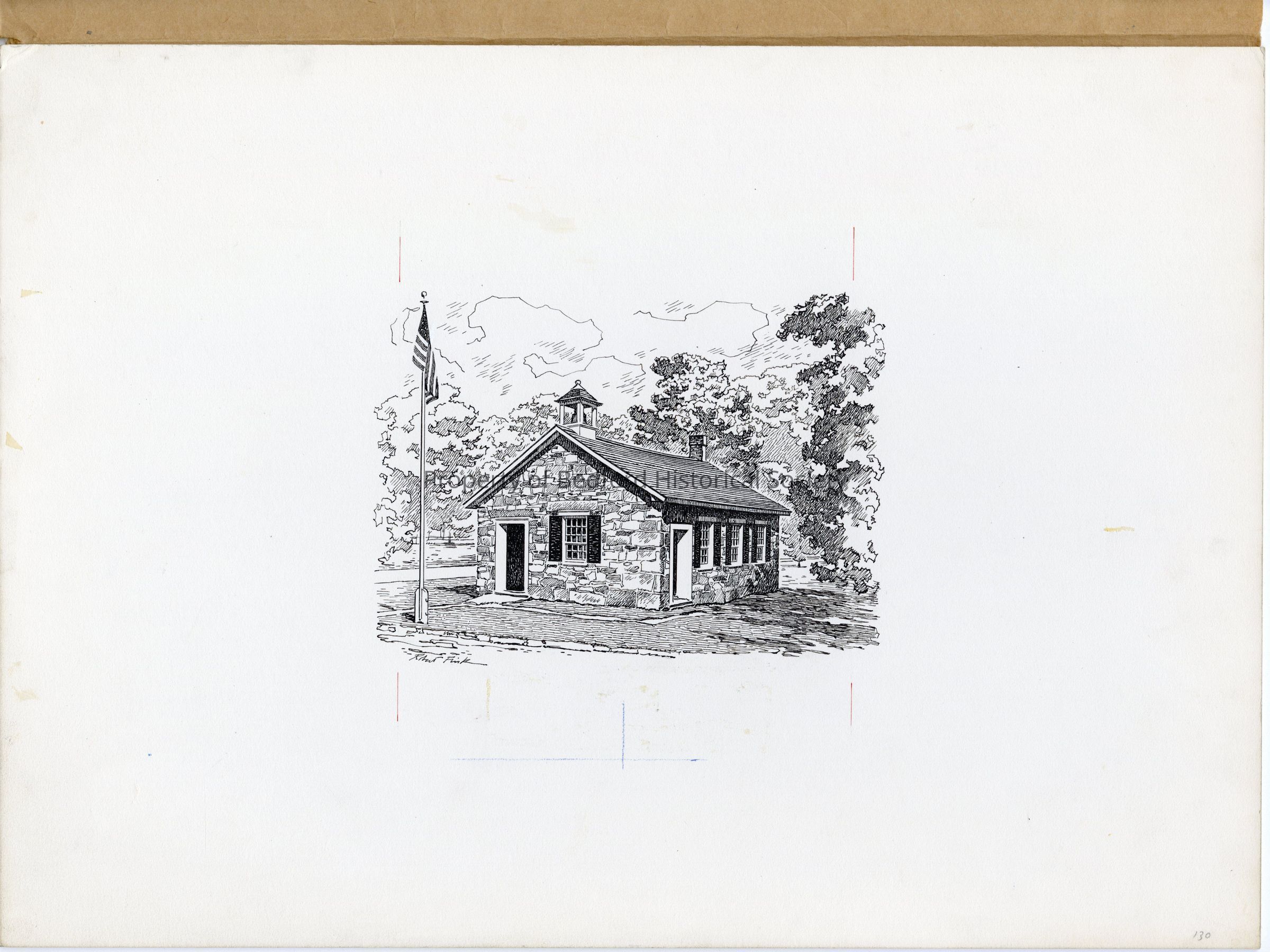 original drawing of School House by Robert Fink later uses for Bedford merchandise, 1980?