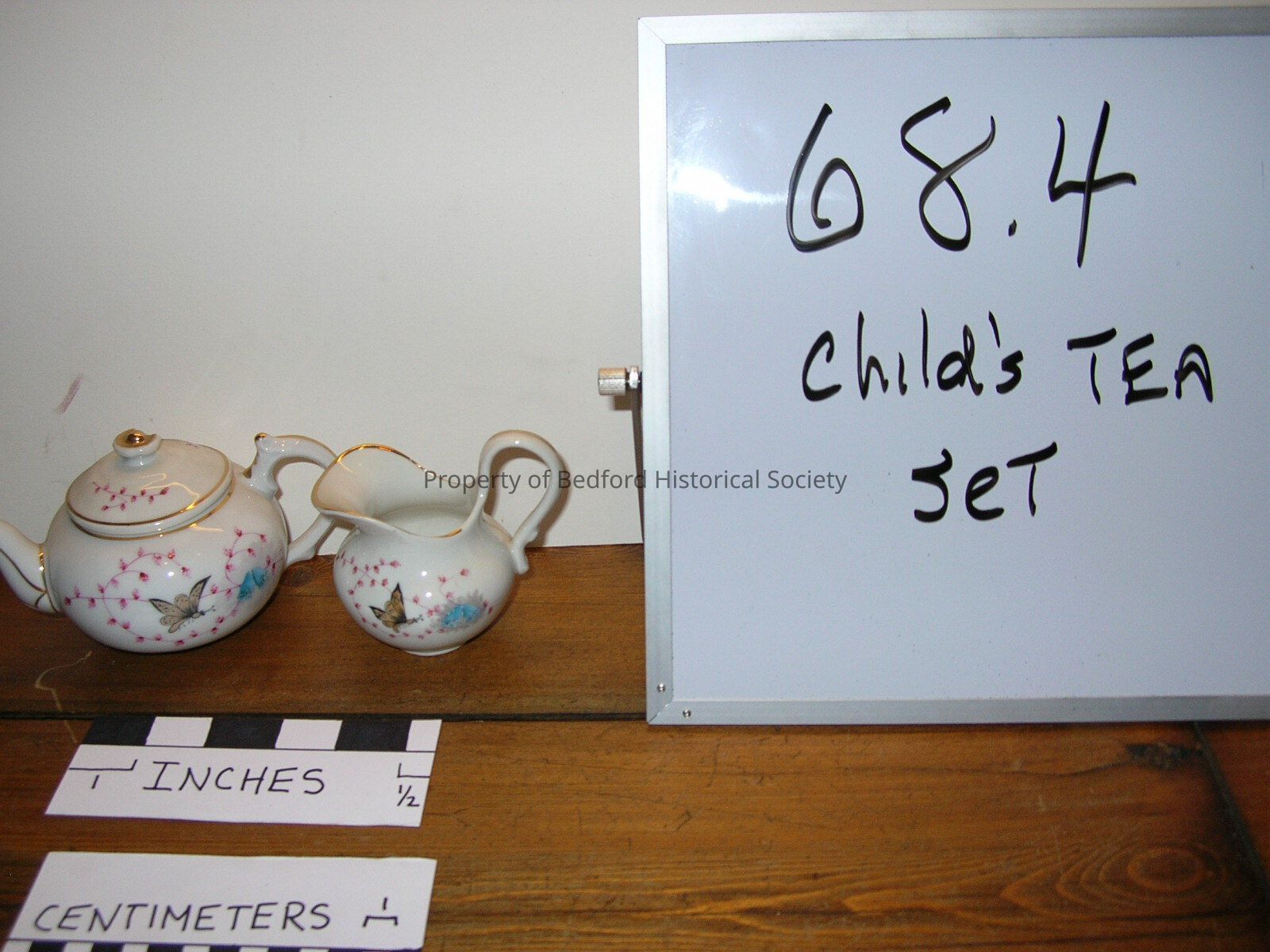 Child's Tea Set Set includes: Pot, Sugarbowl, Creamer, teacups & Saucers (only two cups & saucers are on display with the pot, sugarbowl, and creamer--the rest are in storage)