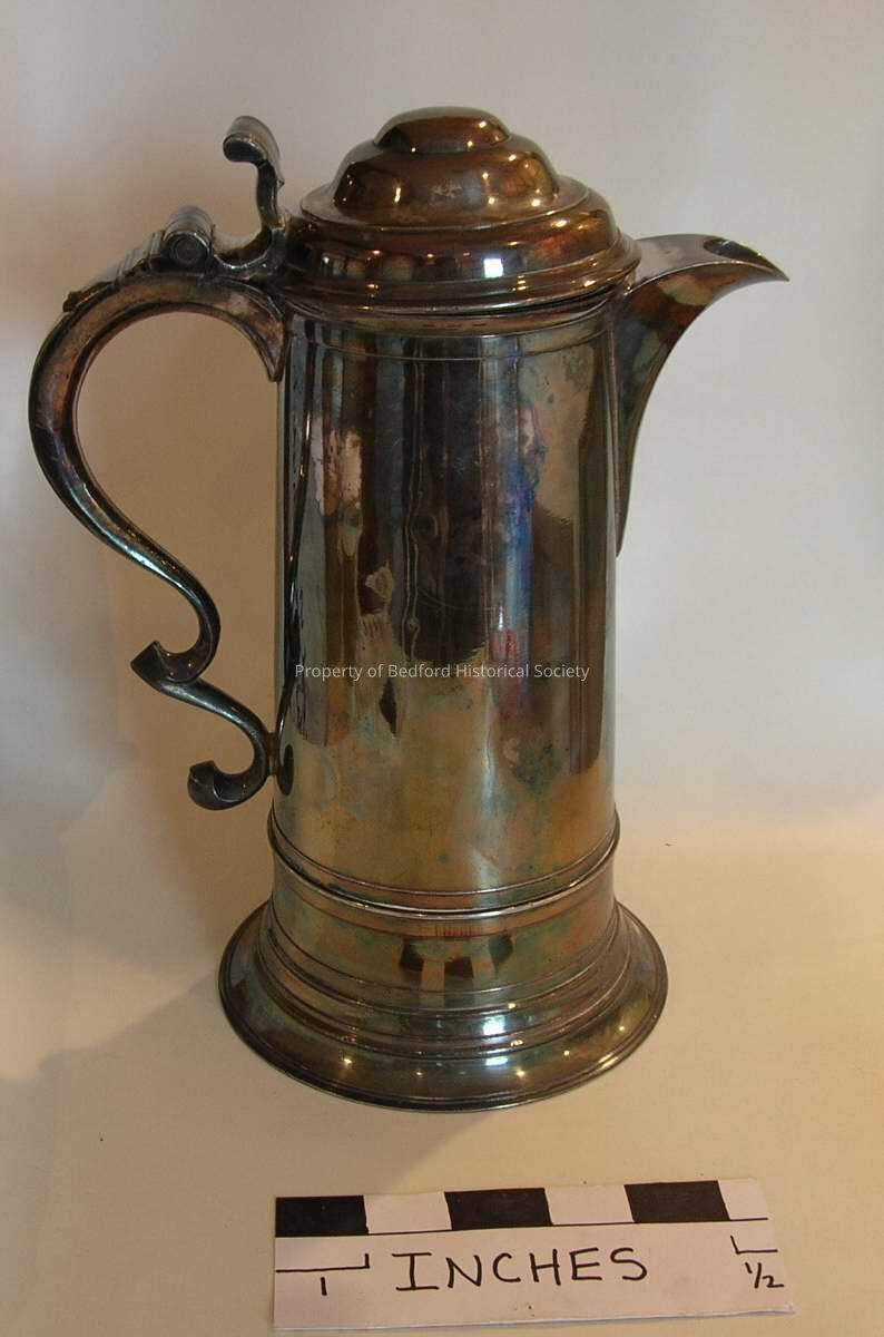 Catalogue card: "Pewter Communion Service consisting of a pair of 7" chalice cups (circa 1825-7), pair of 9 3/8" diameter communion plates and communion flagon with hinged cover and thumb rest (12" tall and 6" at base). All pieces made by Boardman & Co., New York. (Eagle marked, also marked N. York). Used in Methodist Church at Bedford Four Corners (now Historical Hall).