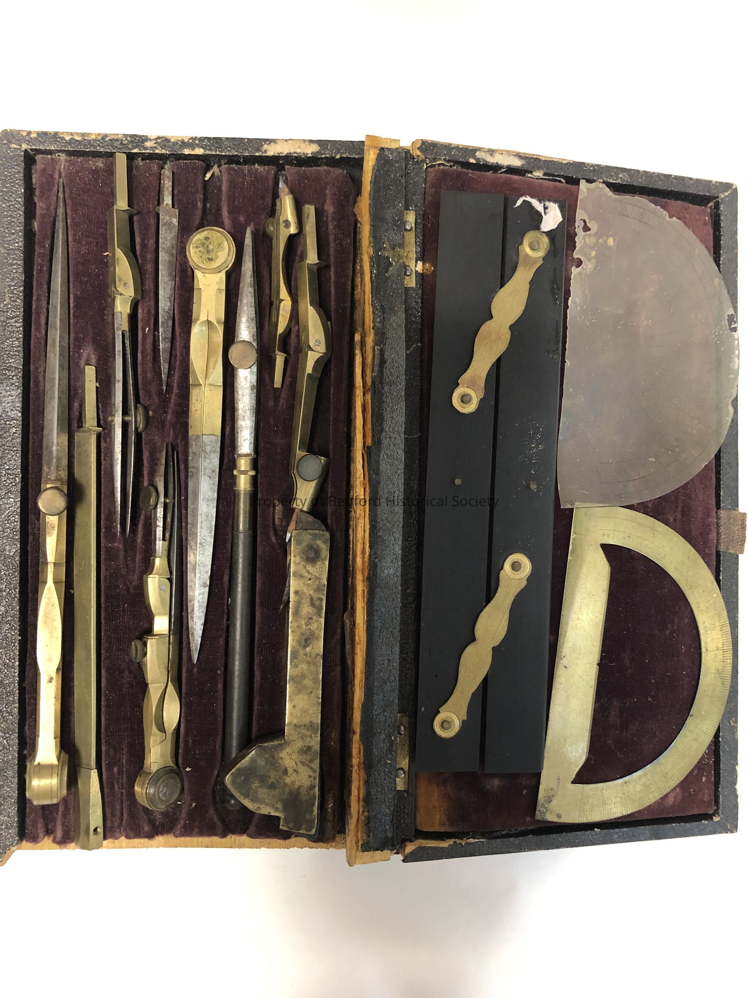 A set of drafting tools in a box with velvet fabric inset to hold instruments in place. The tools are brass and the wood case is in two separate pieces without hinging..
