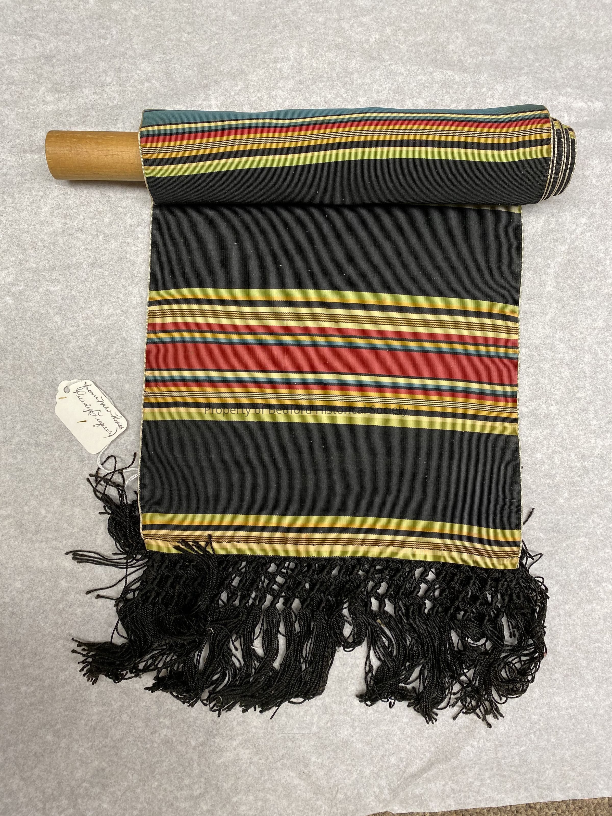 Italian silk sash with striped design on black fabric with fringe from Mrs. Holmes Purdy (Luquar)