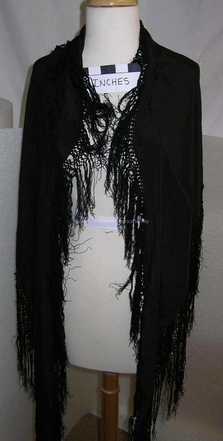 Black silk crepe de chine shaped shawl, with black fringes. Oxidized, shedding. I have placed this in the discard box as it is disintegrating and potentially contaminating other costumes (EZ 2008)