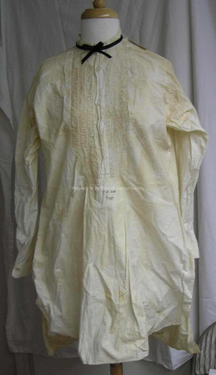 Gentleman's dress shirt, 19th century, band collar wuth buttonholes for a collar, and buttonholes down front for studs, front panel of shirred bands inset with very narrow bands of cotton embroidered with french knots, long sleeves with french cuffs that can be worn buttoned without cuff links, hand written in ink: "G.B. Betts, Europe"