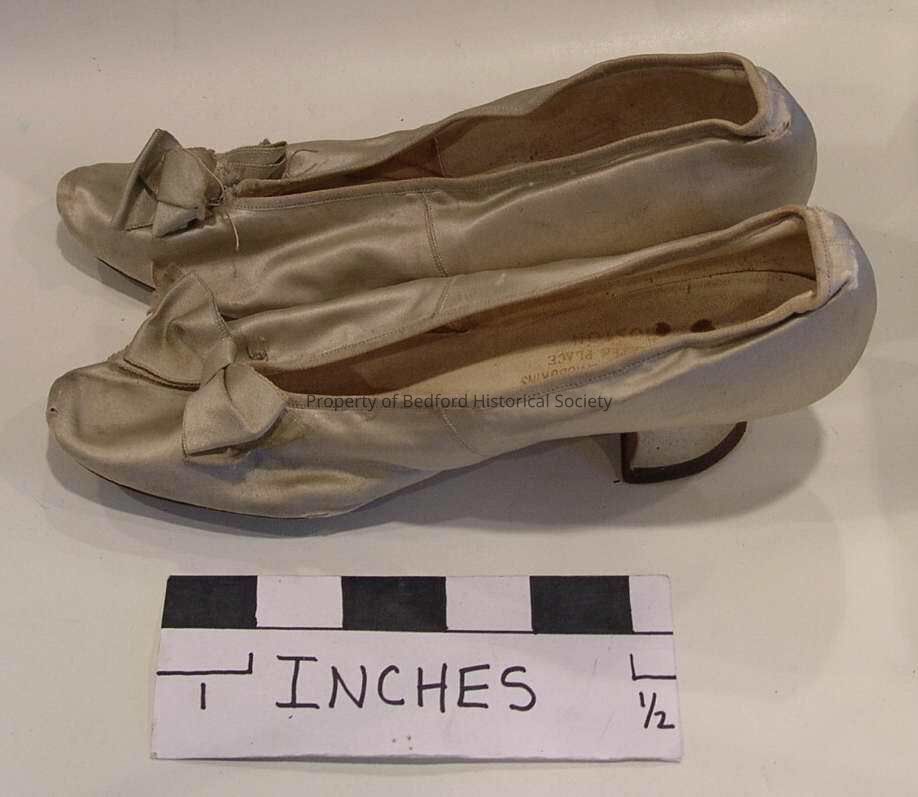 Pair of woman's shoes with bow embellishment "Thayer, McNeil & Hodgkins; 47 Temple Place; Boston."