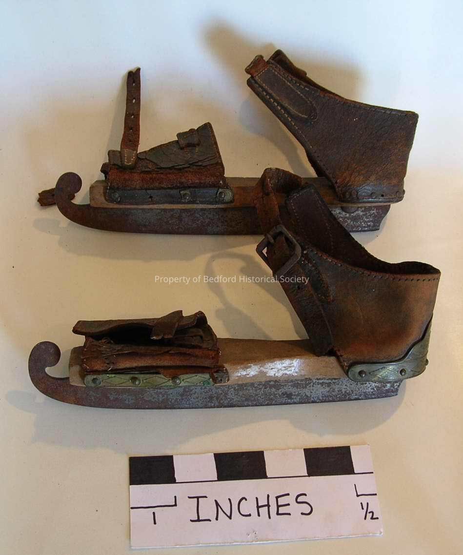 Pair of children's ice skates, leather, iron and wood, mid-19th century