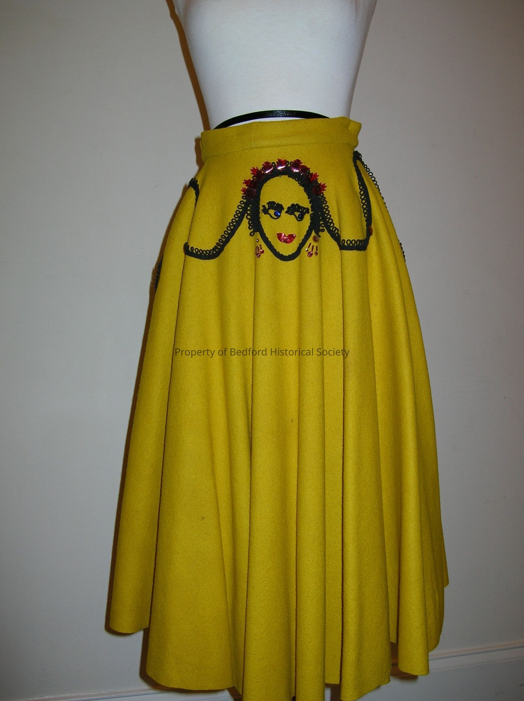 Felt yellow poodle skirt embroidered with blace sequins and black stitching creating a face on the front. 30" long