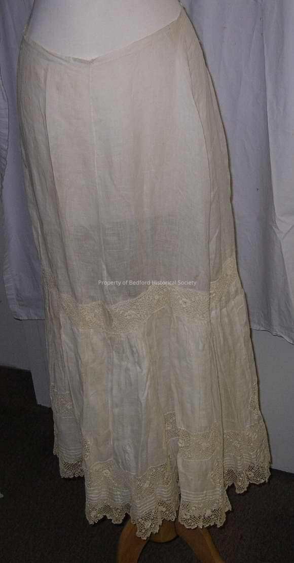 Lingerie Skirt, turn of the century, white batiste inset with bands of Irish crochet lace, also hand embroidered eyelets, finished waistband, good condition