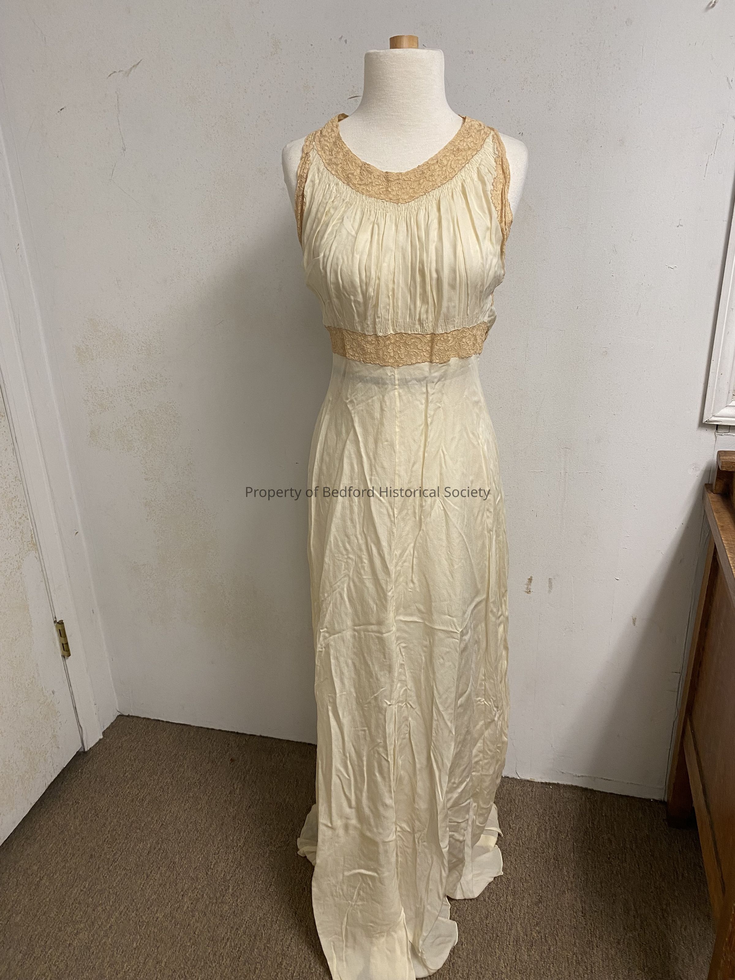 ivory silk wedding slip having beige (possibly originally pink) lace border on collar and underbust. Belonged to Elisabeth *initials "E.L.B" on box