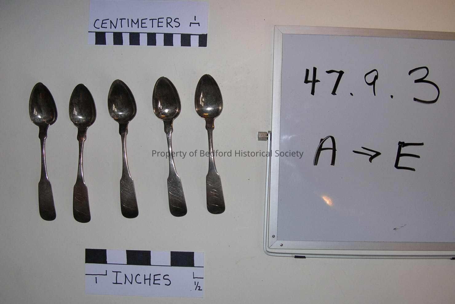 5 silver teaspoons, Hallmark: A. Smith, Bedford, NY 1805 Initials: MHS