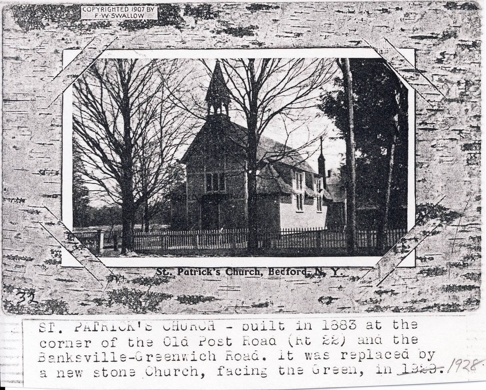 B + W photocopy. Caption: St Patrick's Church- built in 1883 at the corner of the Old Post Road (Rt 22) and the Banksville-Greenwich Road. it was replaced by a new stone Church, facing the Green, in 1929.