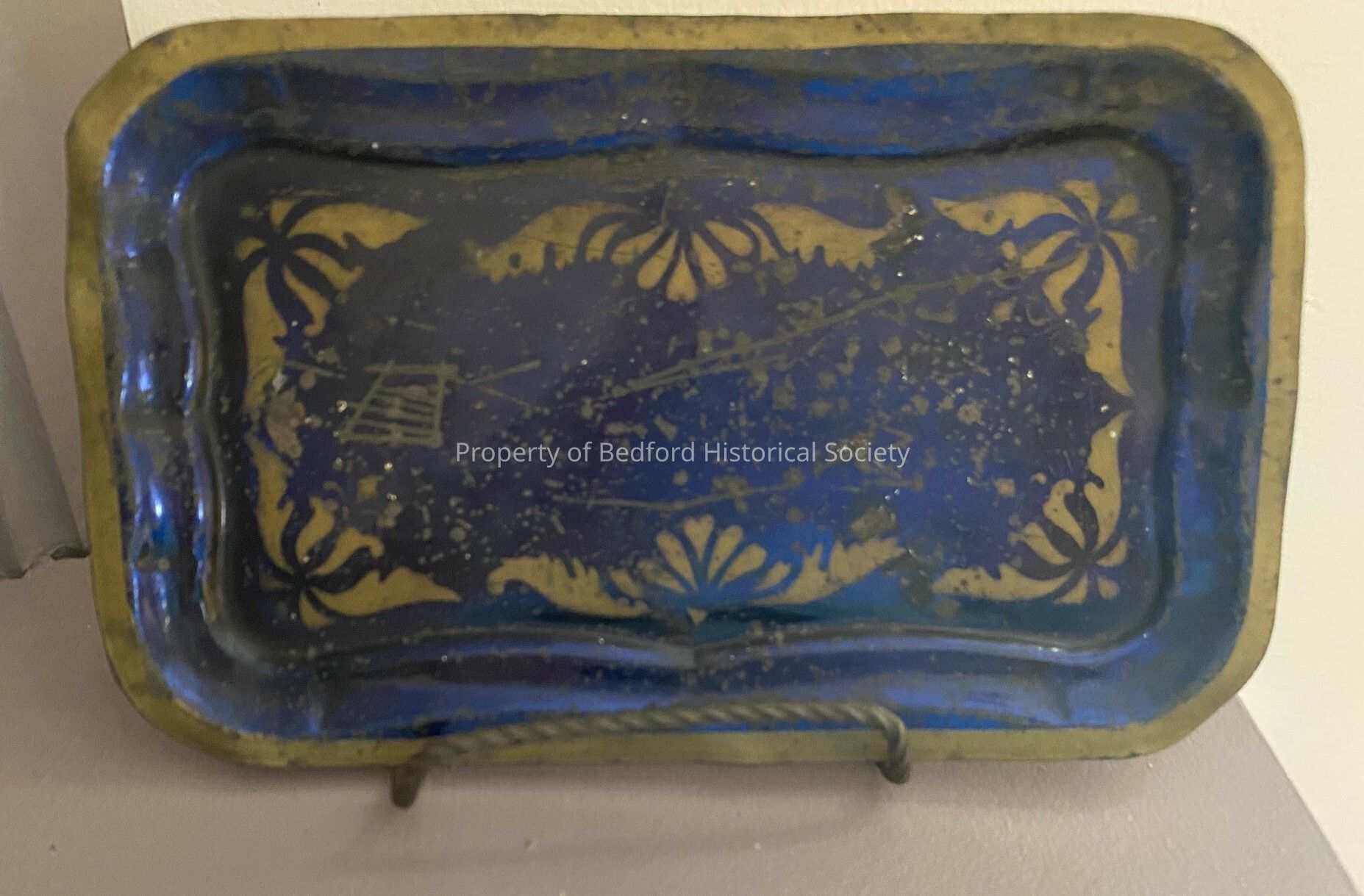Small stencilled metal tray,blue with gold stencilled motifs, sits iin a metal stand