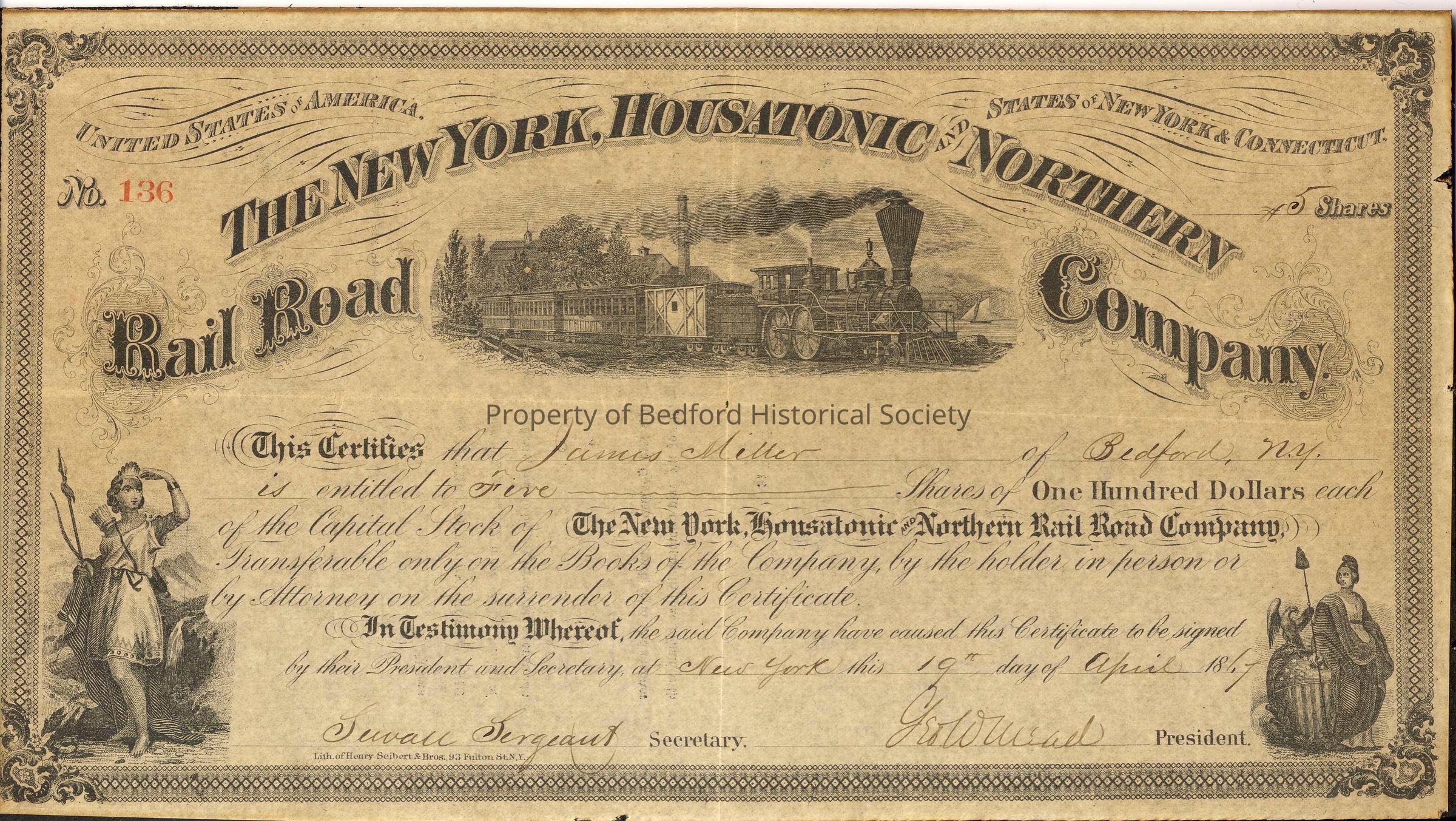 Stock certificate of James Miller, April 19, 1867, for 5 shares of $100 each, The New York, Housatonic and Northern Rail Road Company.