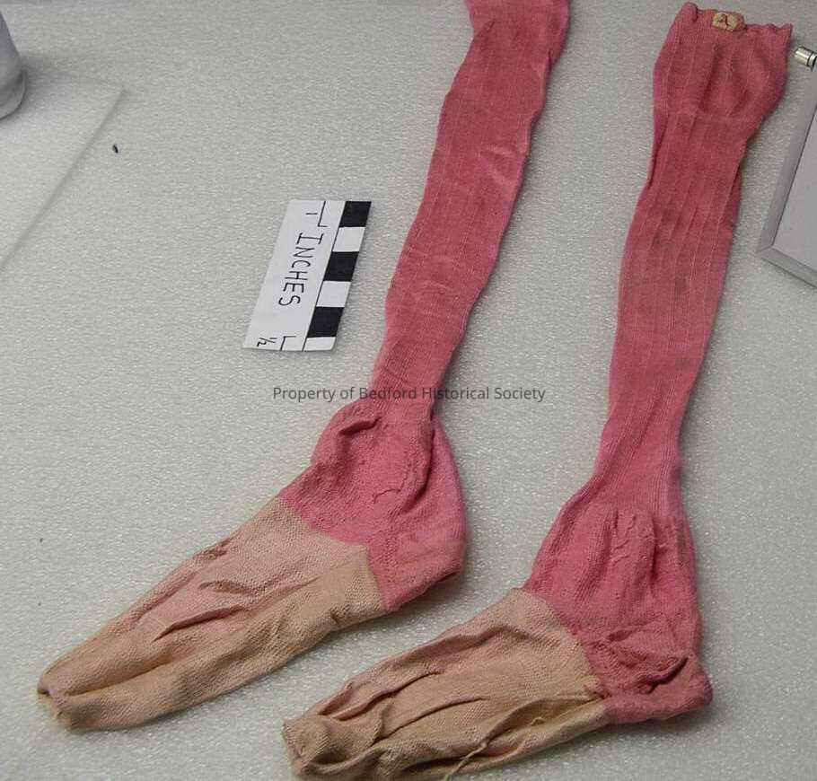 Stockings of pink ribbed silk, some holes, pink silk rose.
