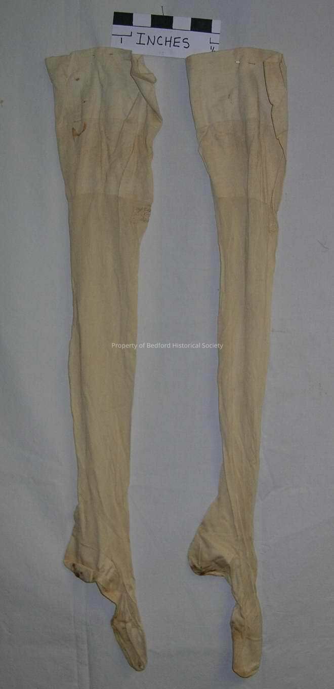 Pair of ivory cotton long stockings with initial "M" inside.