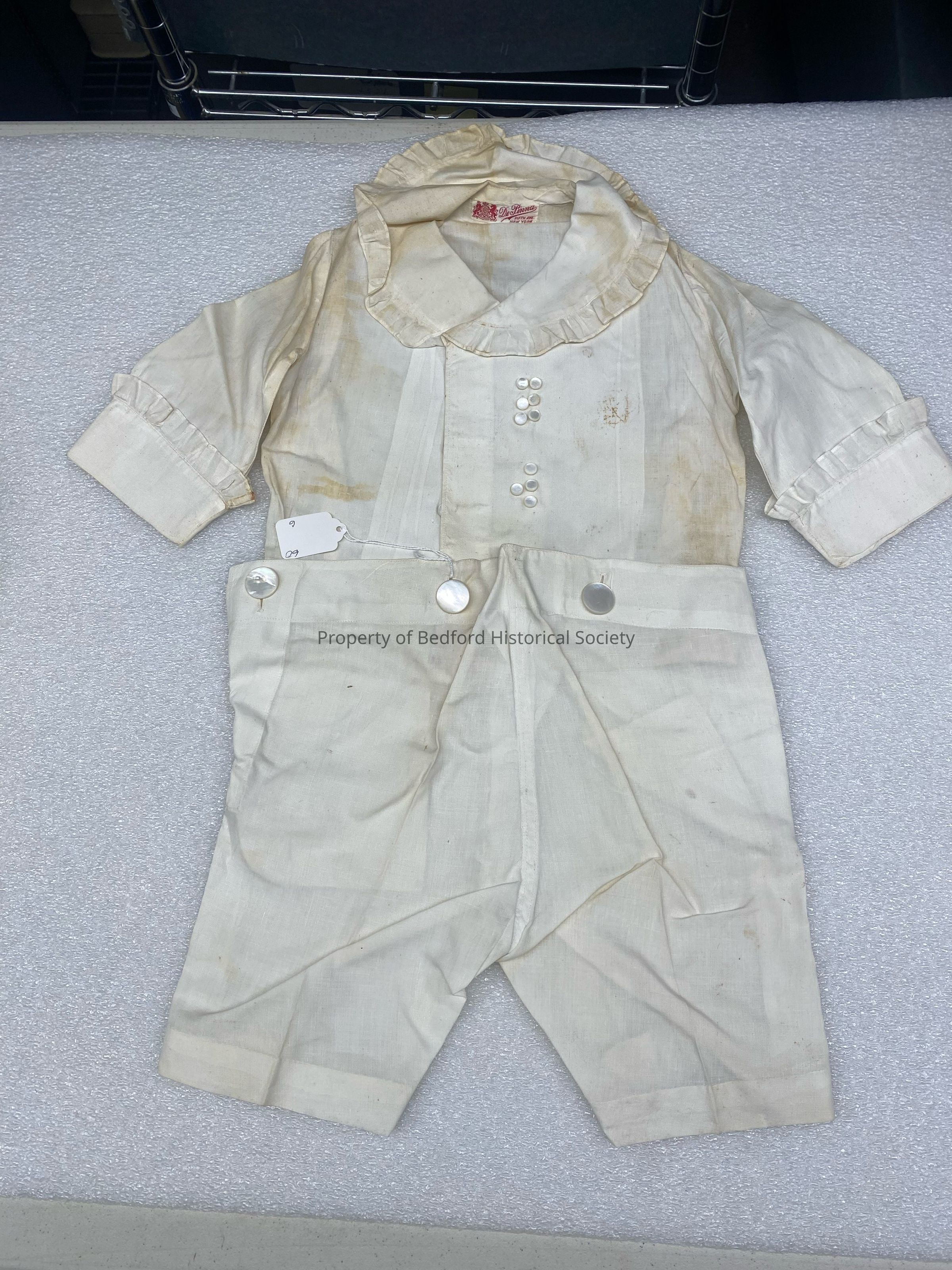 Toddler’s two-piece white pant suit with ruffled collar and detachable shorts, mother of pearl buttons with clothes label “De Pinna”