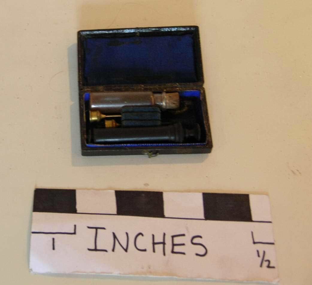 Syringe in case- "a very rare 1860's hypodermic syringe by Tiemann, New York, and sold by Codman & Shurtleff, Boston.Inscription/Signature/Marks