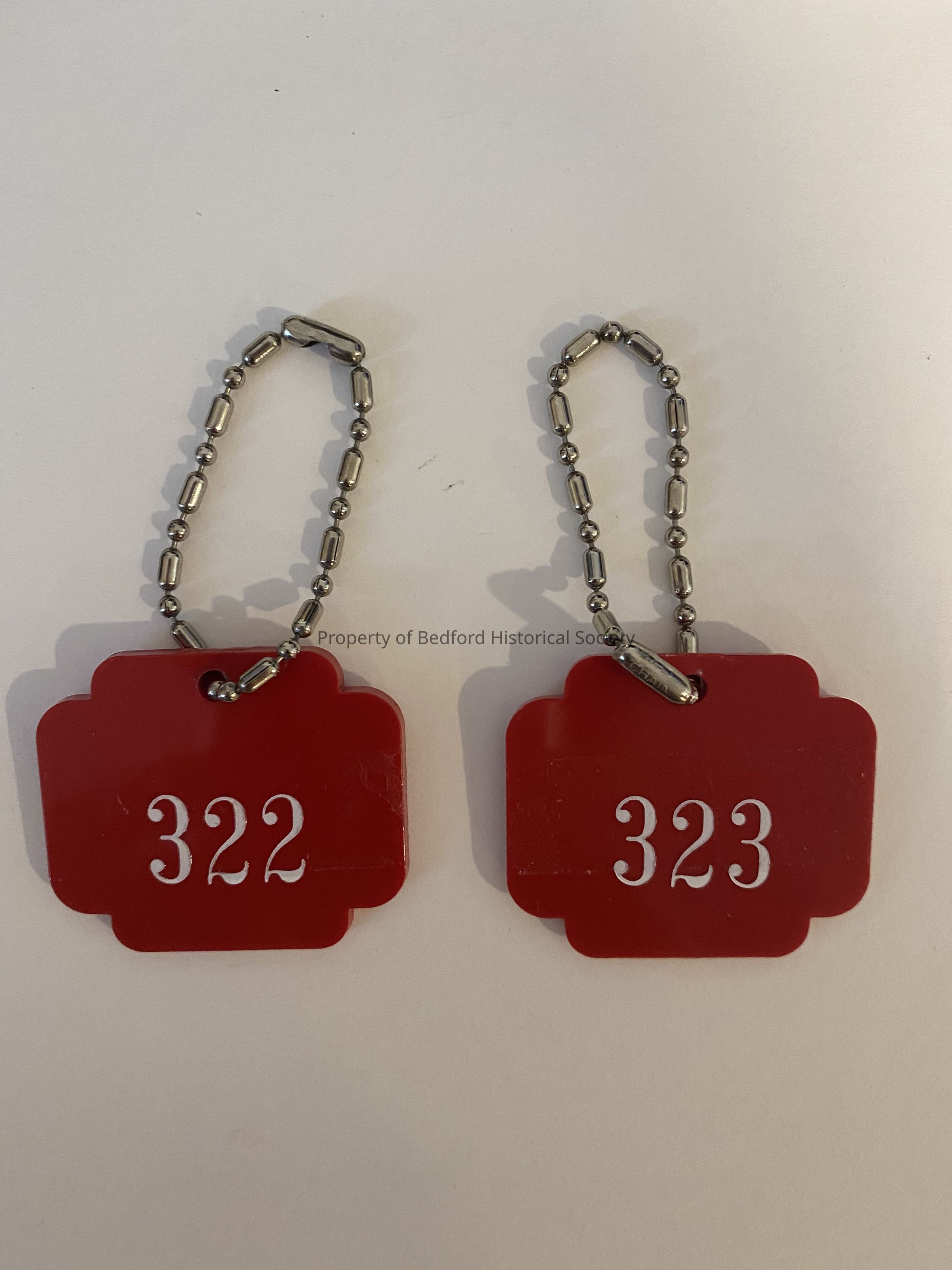 Two red plastic identification tags for Bedford Riding Lanes Association, Inc. with white letters "322" and "323" on one side, other side "B.R.L.A.