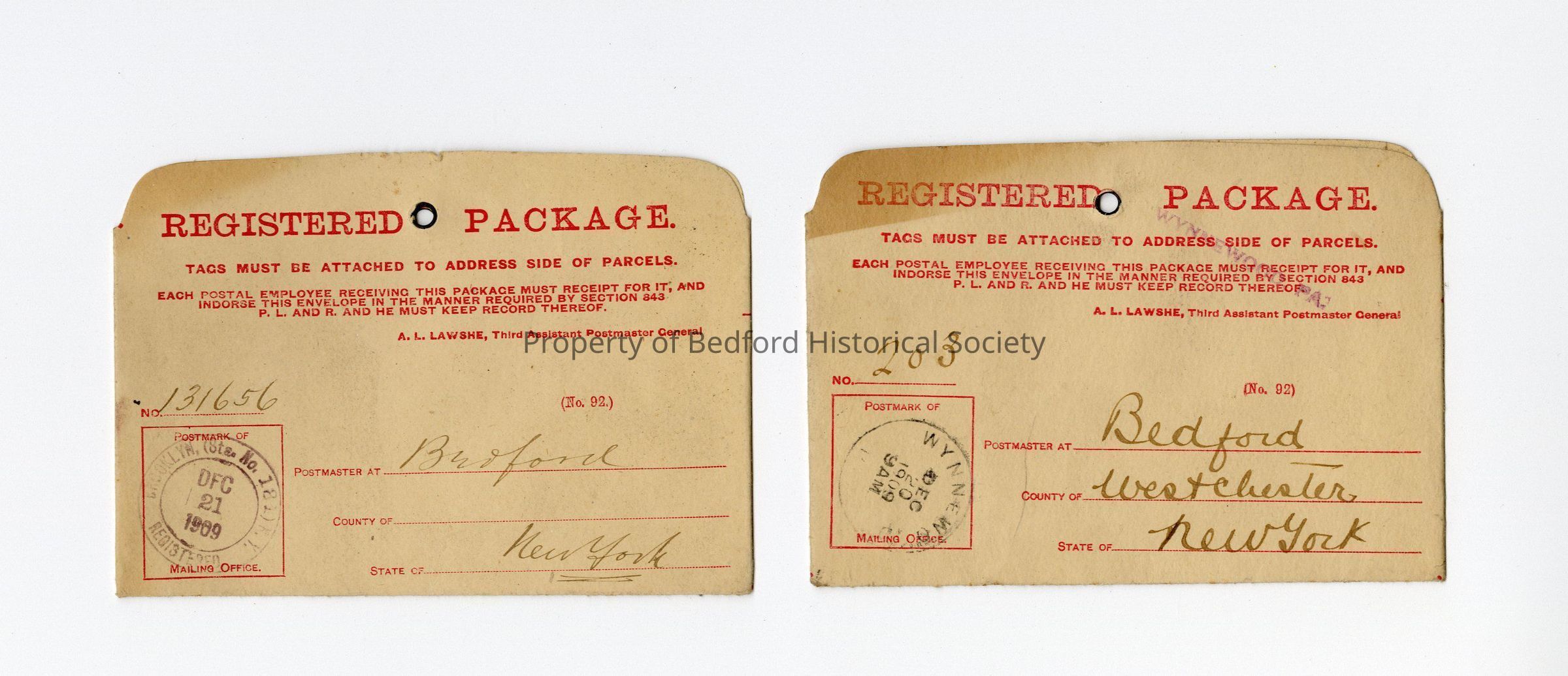 Two Registered Package tags from Bedford