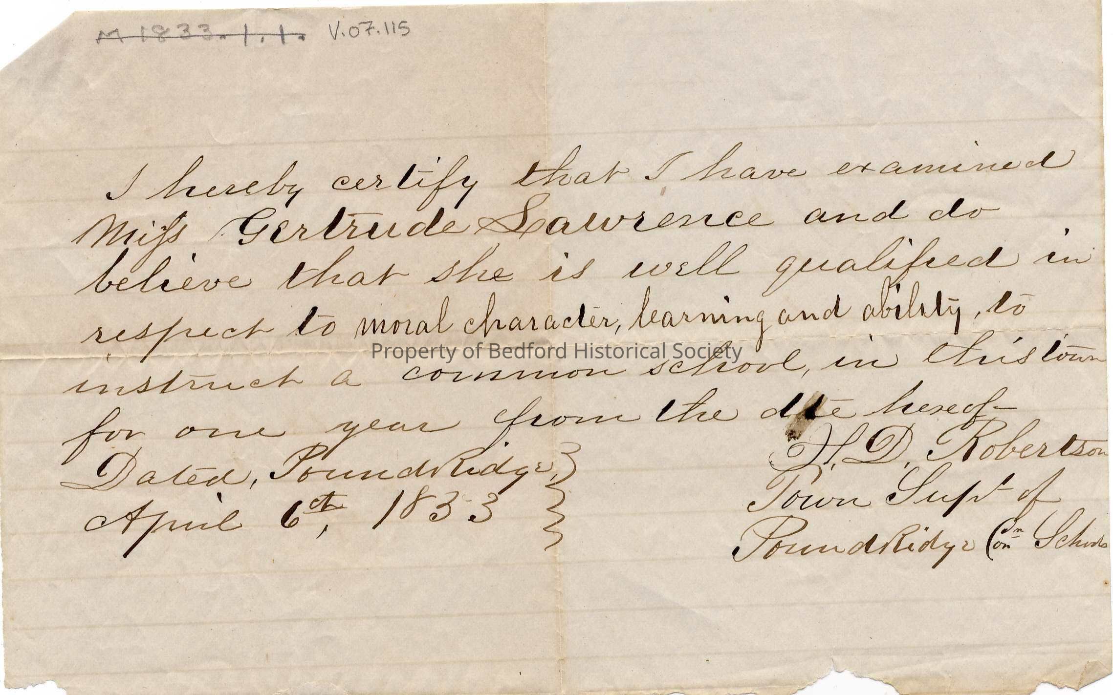 Teaching Certificate of Gertrude Lawrence, 1833 Signed H.D. Robertson, Town Superintendant of Pound Ridge Common Schools