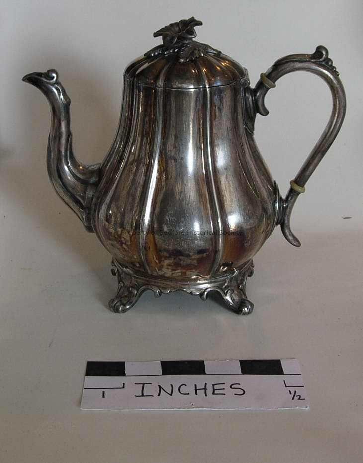 Silver plated Teapot, Reed and Barton, plated, fluted, hinged cover, ivory insulator on handle. Serpentine spout, 4 short feet, Mate to 144.1 and 143.1.