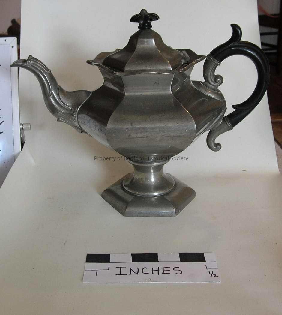 Pewter tea pot, James Dixon & Sons, 1844, hexagonal shaped bowl, base and hinged cover--shaped wood handle--petaled lid finial, Amreican