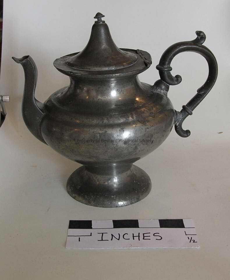 8 1/2" round pewter teapot, American, no mark, shaped-- 6 1/2" diameter, shaped spout and handle, simple curved base, pewter finial on lid, early 18th century