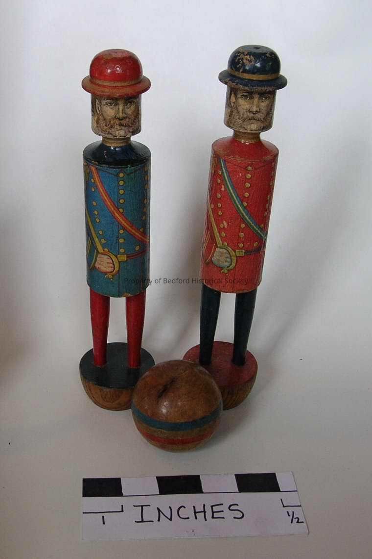 Catalogue card: The tenpins are in the form of soldiers in red and blue uniforms in box with label: Patented 1885. Value $85. Set by Margaret Whitton, Wilton, Conn.