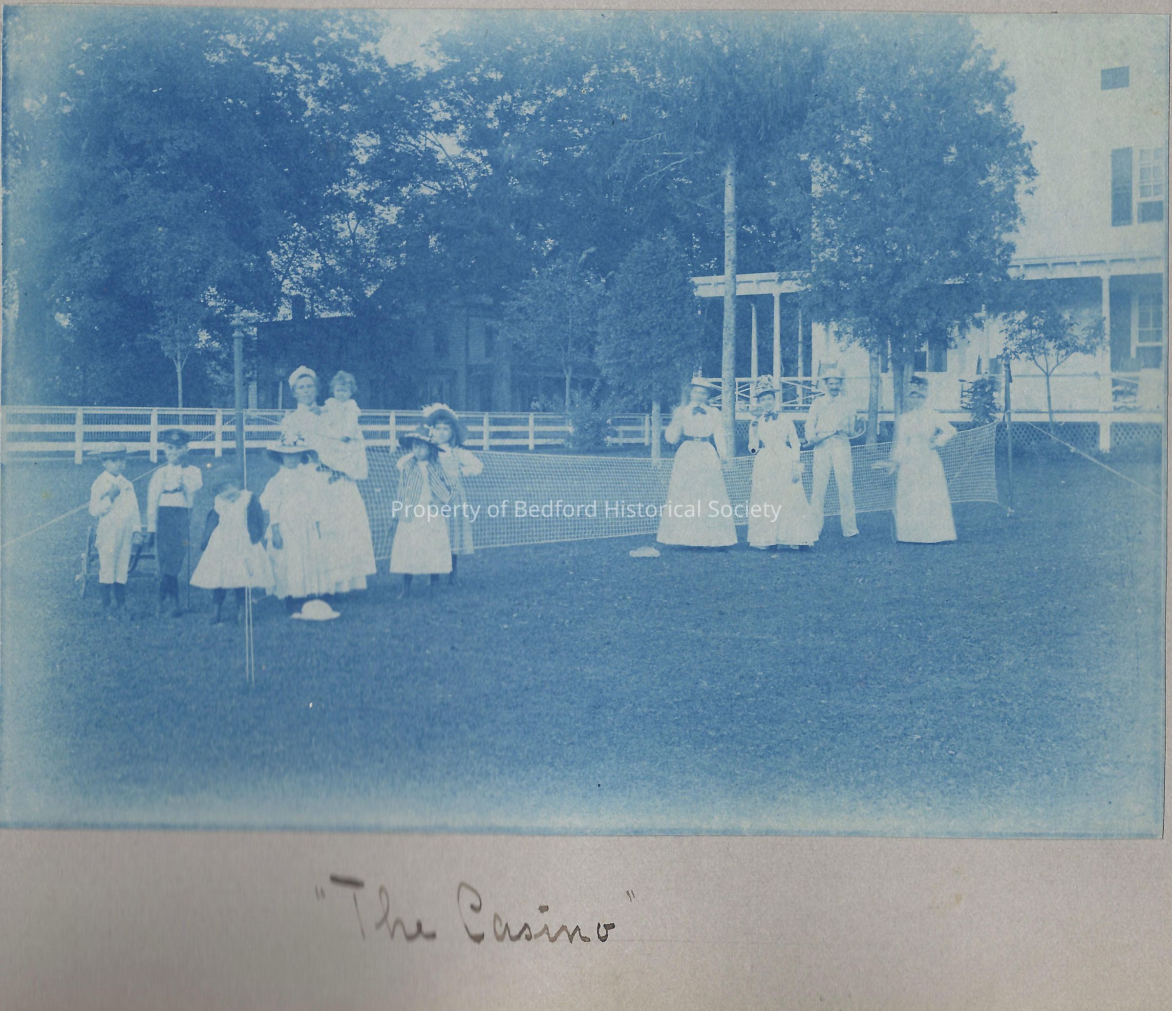 Group of adults and children posing in front of a tennis net with inscription "The Casino", c. 1890s. Part of Renwick scrapbook.