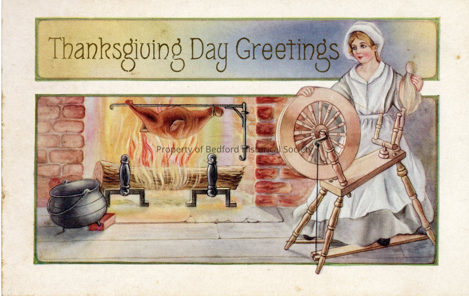 Greeting Card with illustration of Colonial Revival woman working at spinning wheel in front of roasting turkey on open fire. Addressed to Mrs. Mary A. Clark