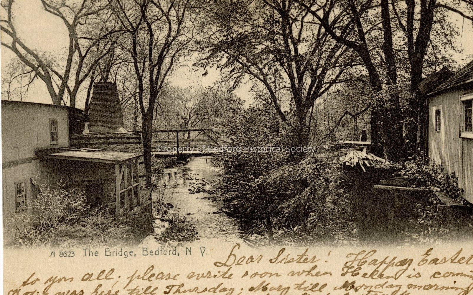 Postcard from 1907 of a Bridge between two structures. Location unknown. Possibly Mianus River area? Has writing in ink on bottom.