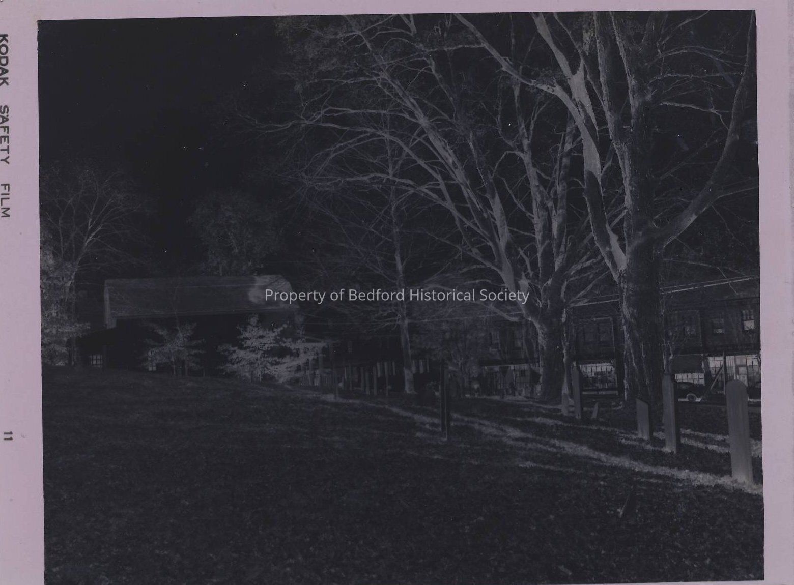 The Old Burying Ground with Bedford Courthouse and General Store in background. Black and White negative.
