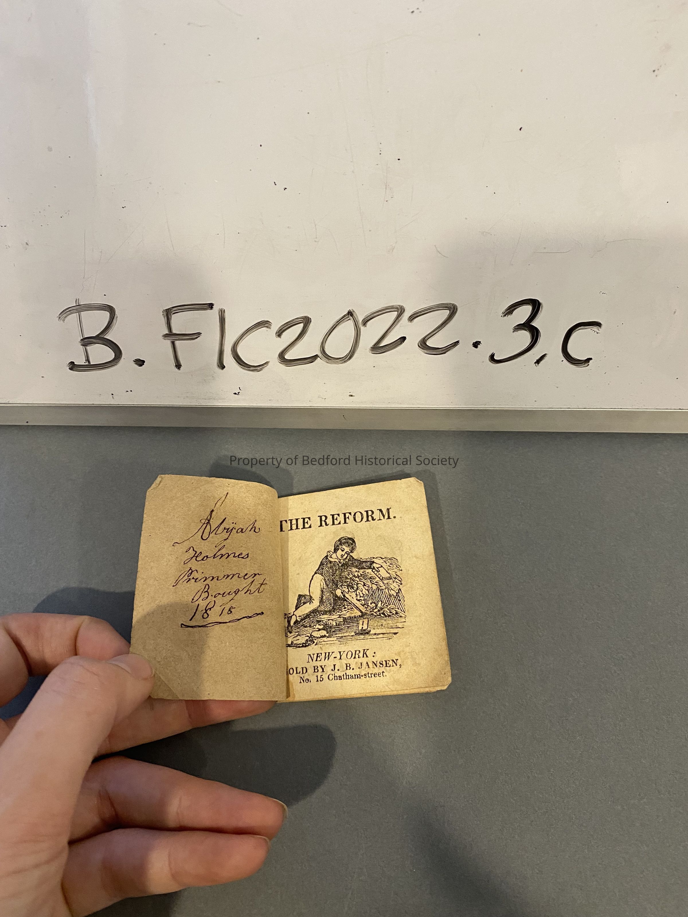 one of three mini booklet primers having belonged to Alijah Holmes. Fornt has picture and poem advertising book store it was sold from. Inside of cover has handwritten inscription: "Alijah Holmes Primer bought 1818"