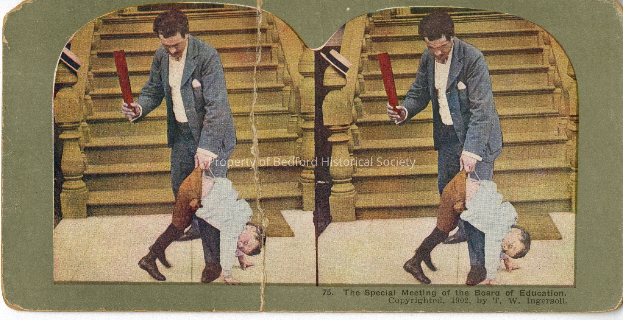 Stereograph of man dressed in blue coat spanking little boy with ruler