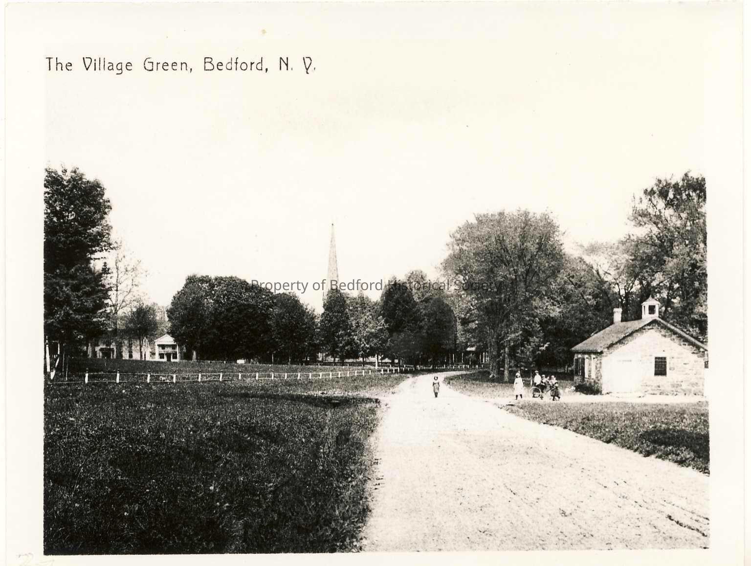 The Village Green and first schoolhouse in Bedford Village--built in 1829. It was fondly called the "Old Stone Jug". It was used as a schoolhouse until 1912 and later rented to the BHS and converted into a museum. Same photo as 110, 1076, and colorized 1141 and 1558. Mounted version in FF Drawer 12