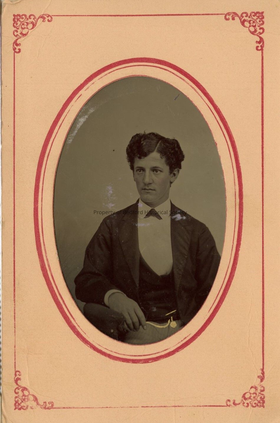 tintype of teenaged boy in suit in peach matte oval frame with red decorative border. Back writeen: William H. Gardner part of Gardner/Sarles Collection