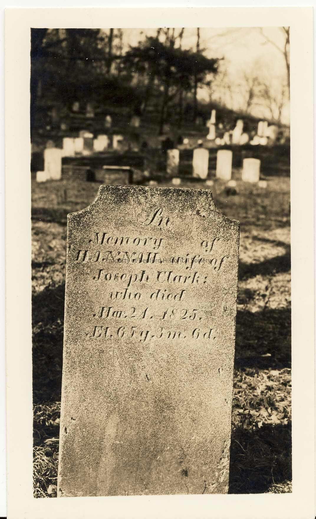 Tombstone of Hannah Clark "In Memory of HANNAH, wife of Joseph Clark: who died Mar. 24, 1825. El. 65 y. 3 m. 6 d."