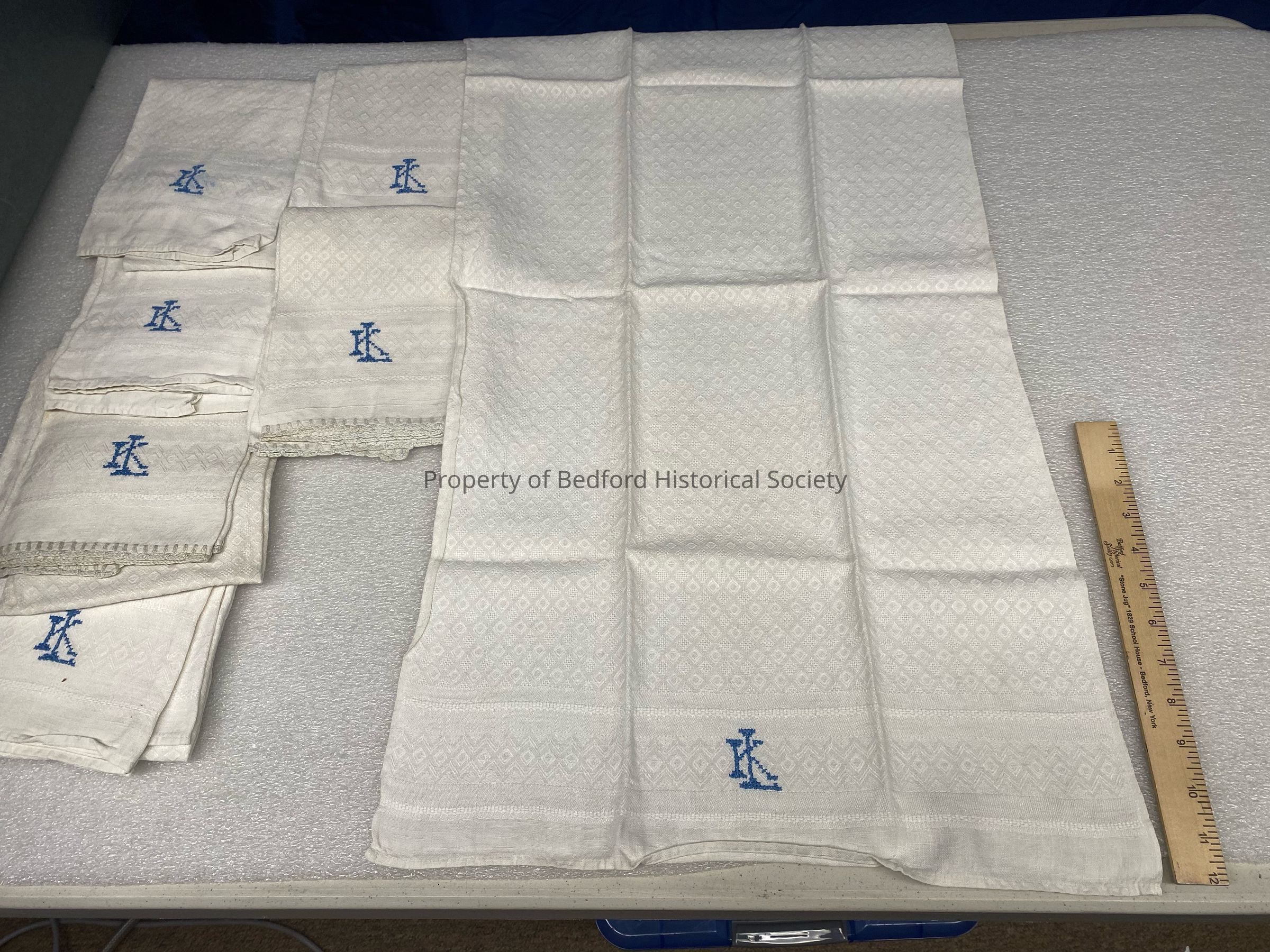 7 hand towels with blue “LK” monogram