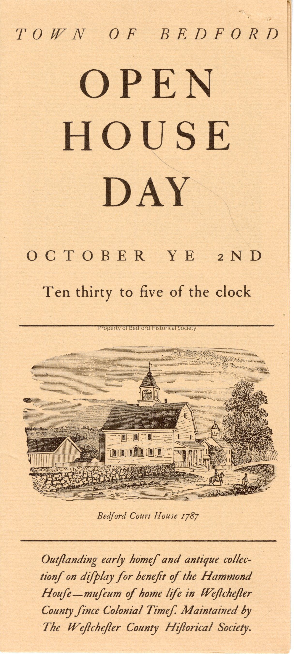 Beige pamphlet advertising the Town of Bedford Open House Day with illustration of Bedford Court House in 1787.