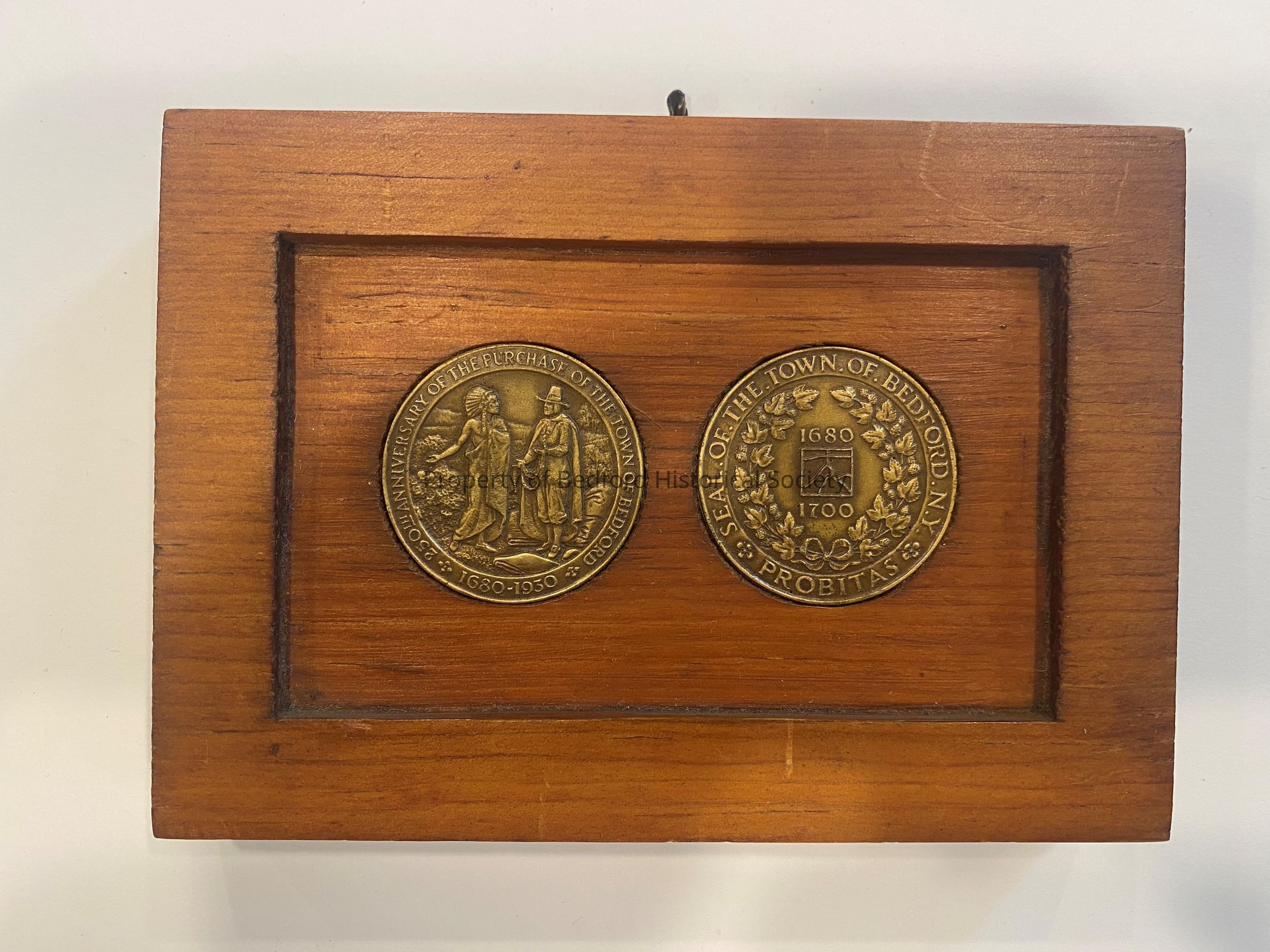 Two bronze medals in wooden frame; commemorative of 250th anniversary of Town of Bedford, 1930.