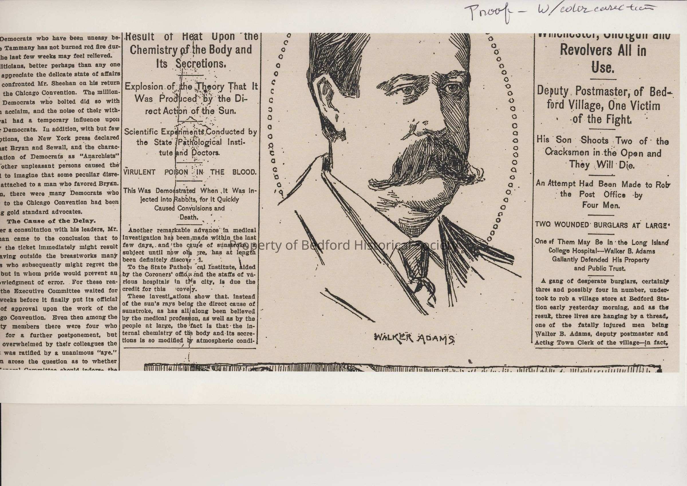 Two copies of a newspaper page. One article discusses a robbery of a village store at Bedford Station.