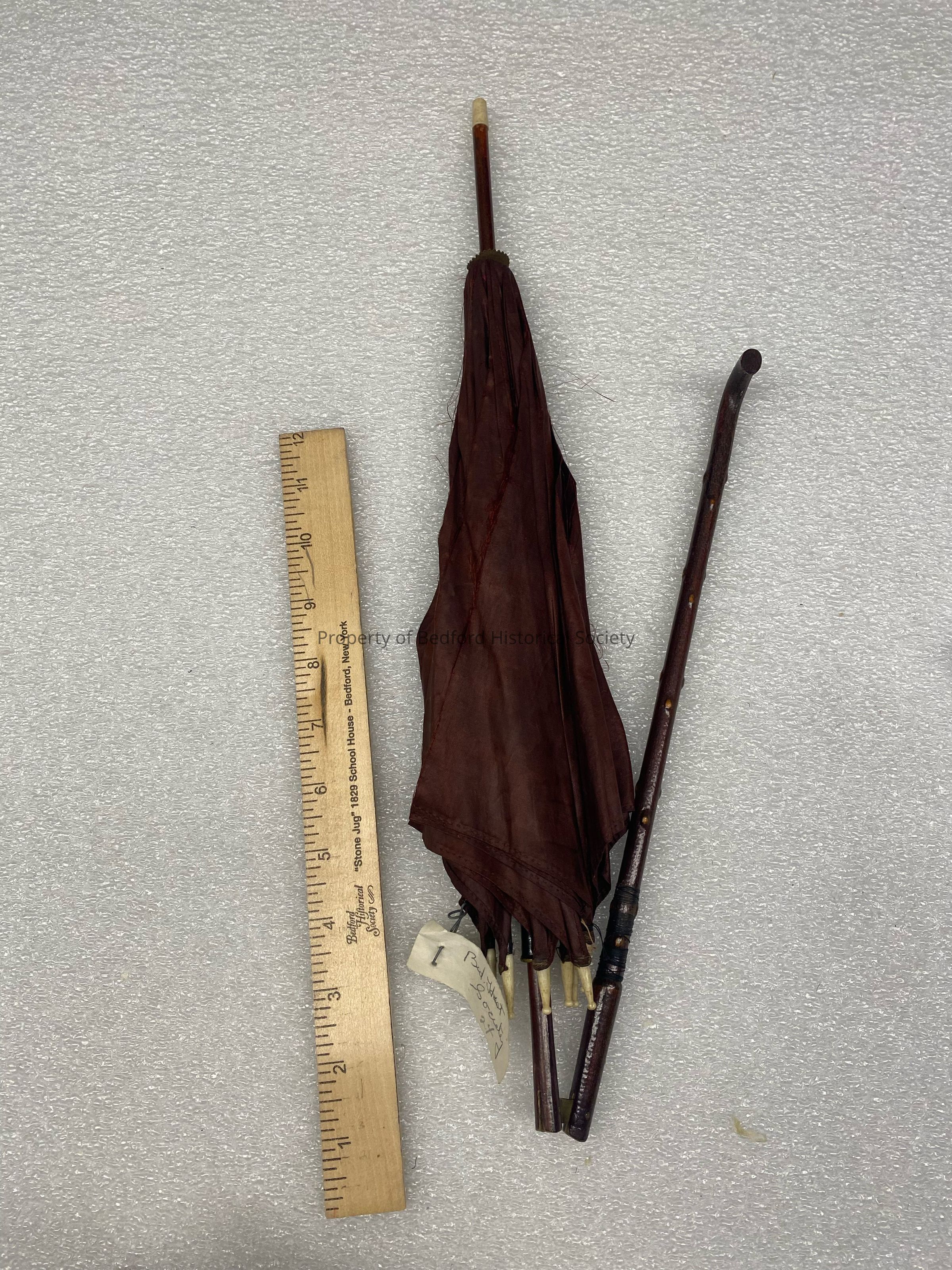 Collapsible red umbrella with wooden crook handle