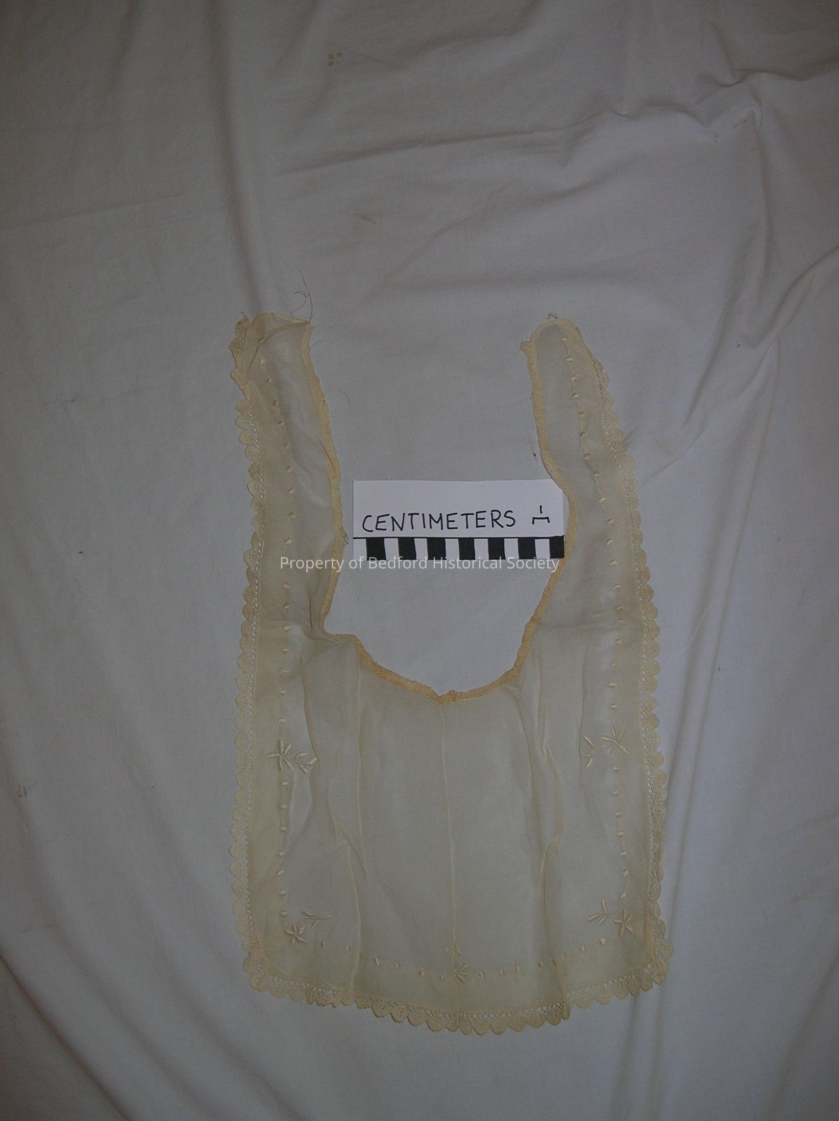 embroidered bib-shaped cloth with lace trim