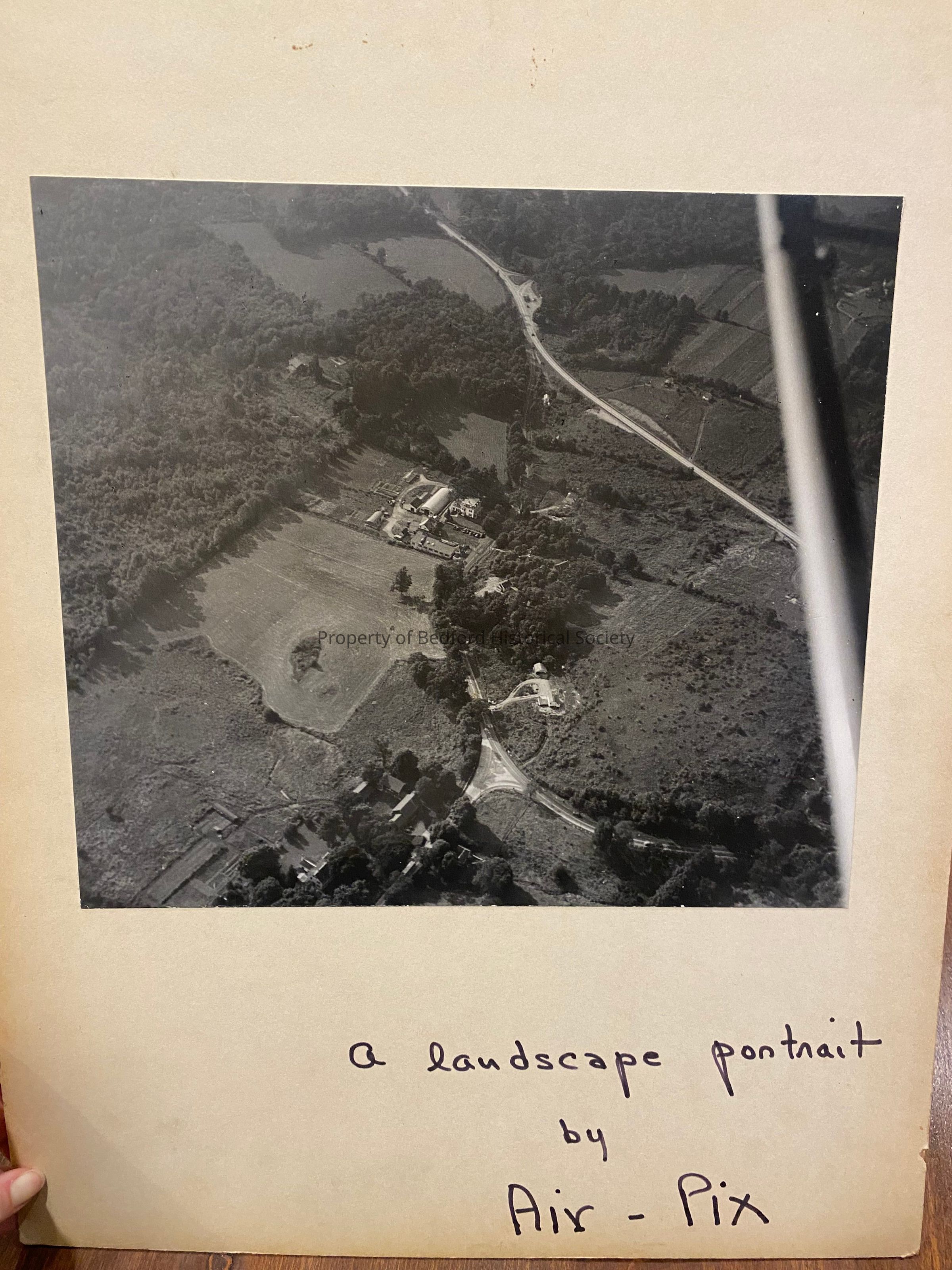 b & w photo of unknown aerial view, possibly a farm near Bedford? mounted on cardboard by Air Pixies, c. 1950s