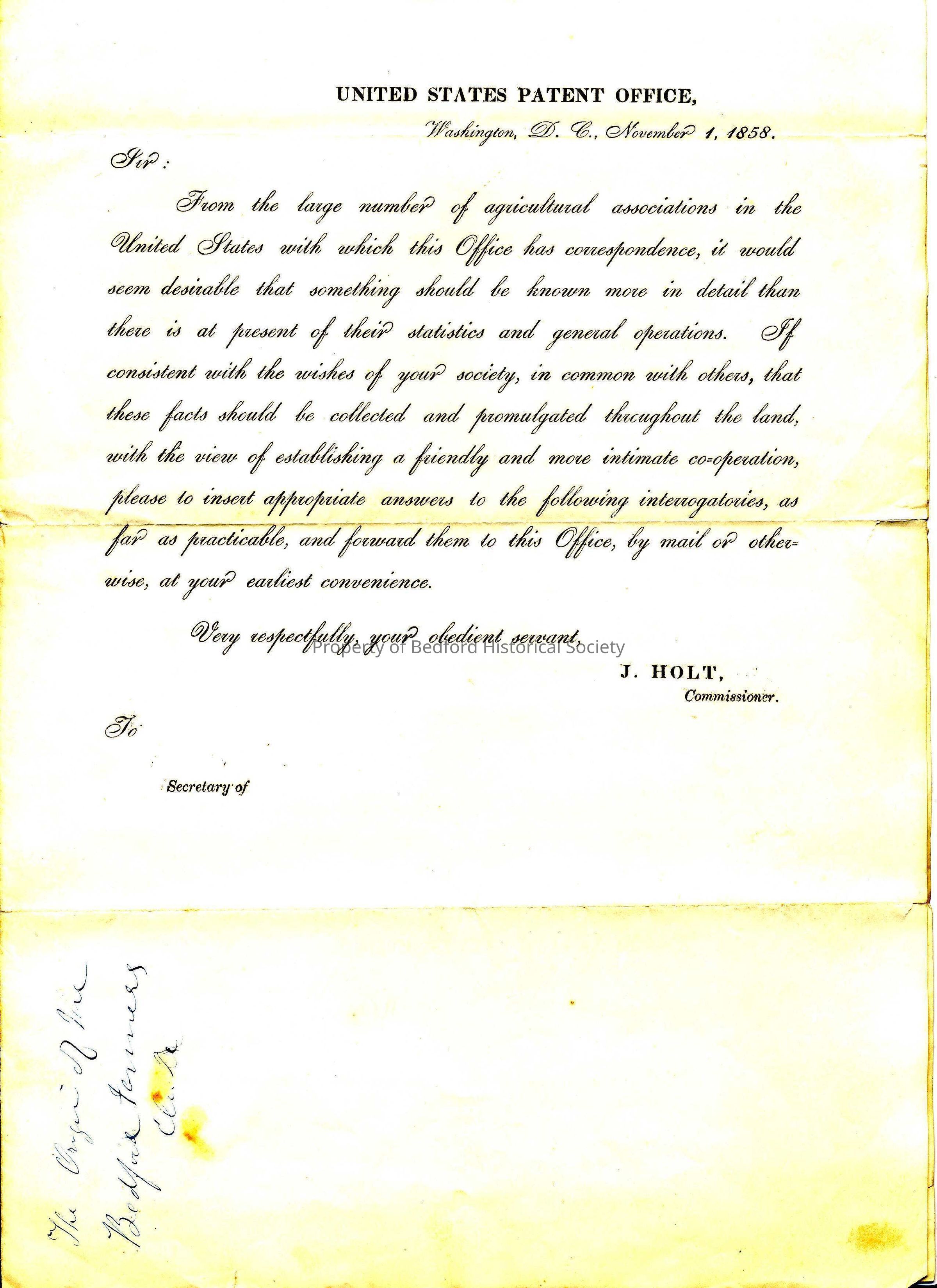 US Patent Office Questionnaire, Nov. 1, 1858 Regarding the Bedford Farmers' Club