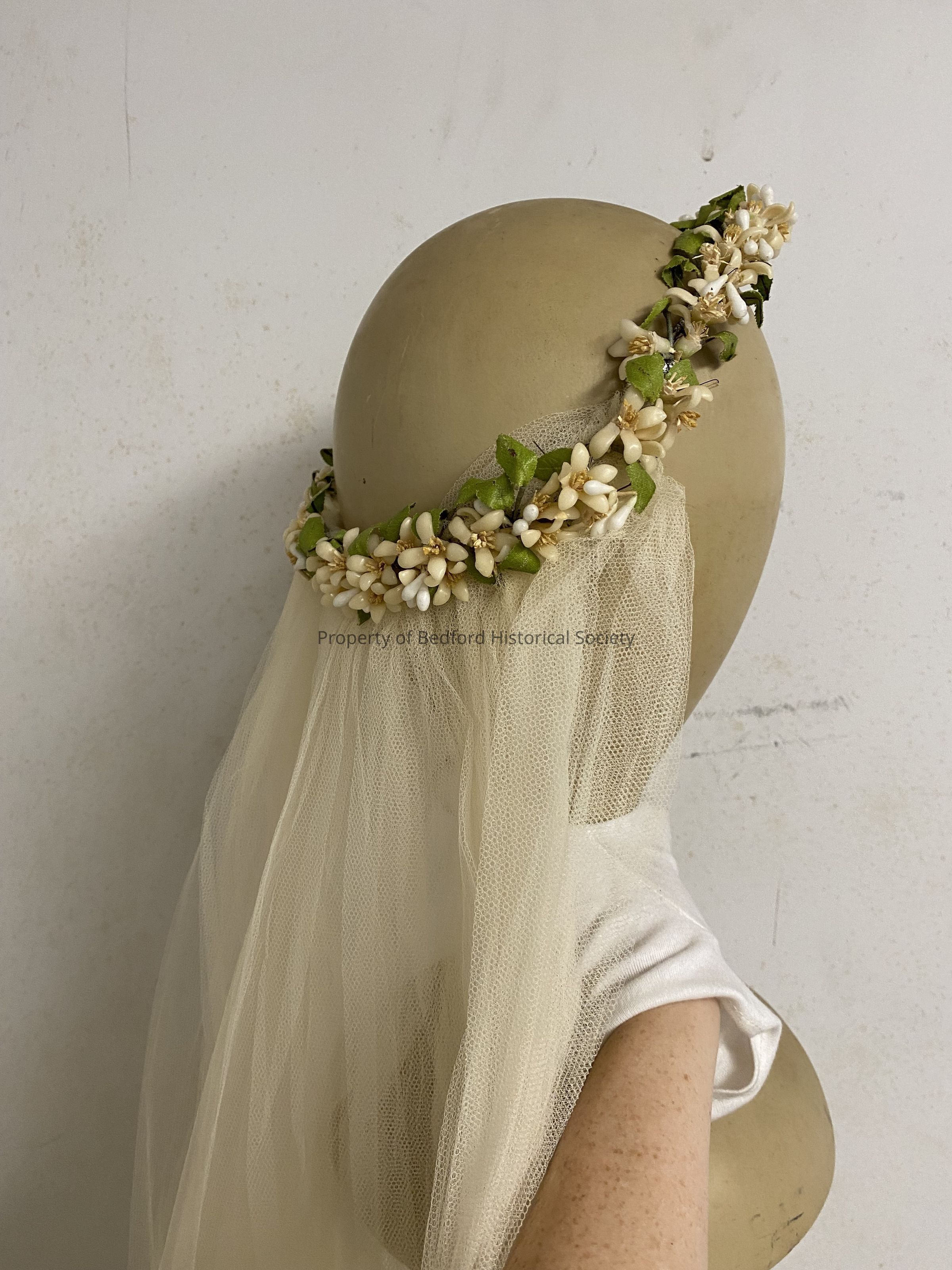 tulle veil with plastic flower wreath. Belonged to Elisabeth *initials "E.L.B" on box