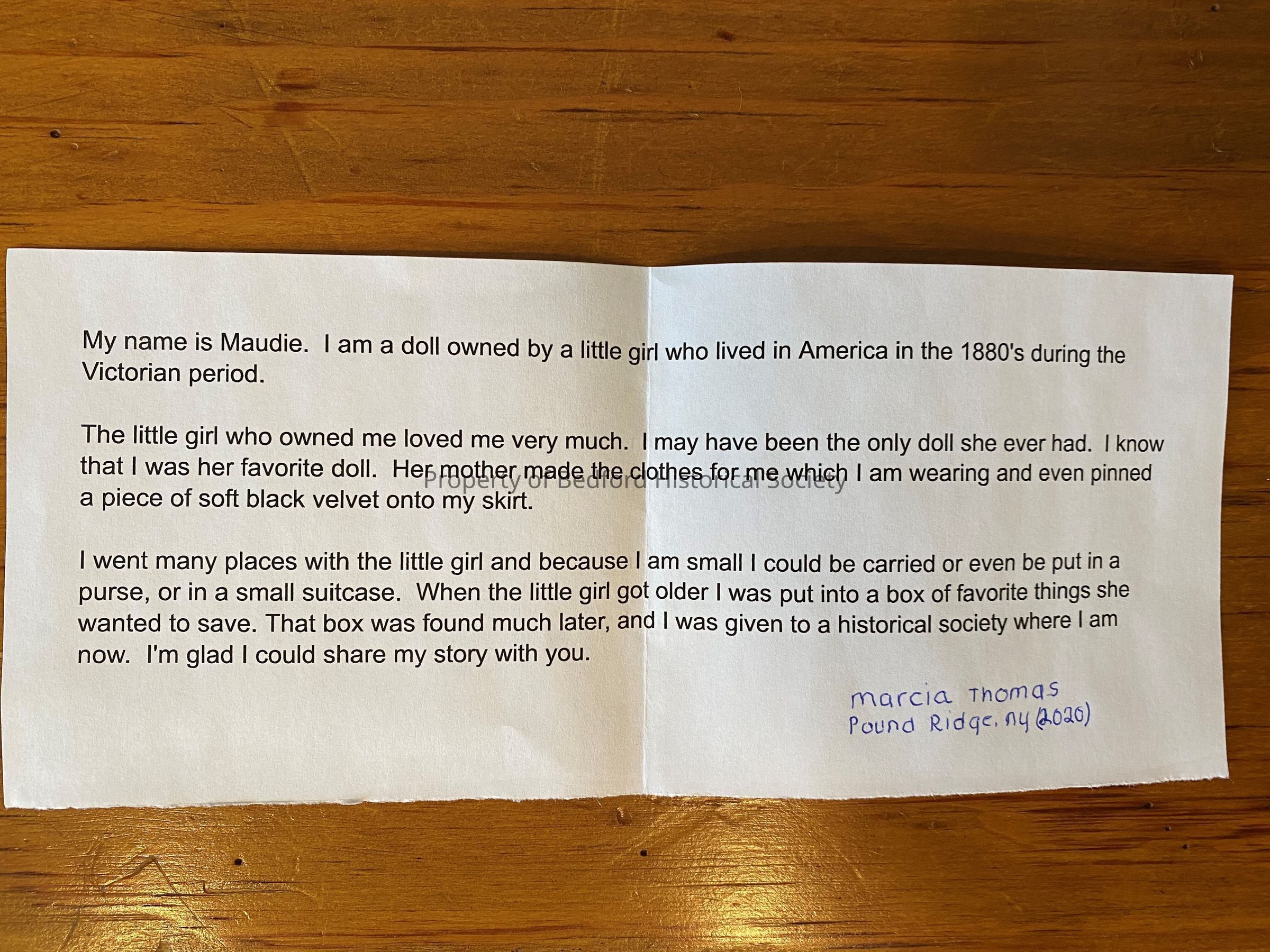 Doll found in Bedford Presybeterian Church rummage sale, came from house in Katonah, and Marcia created story about her