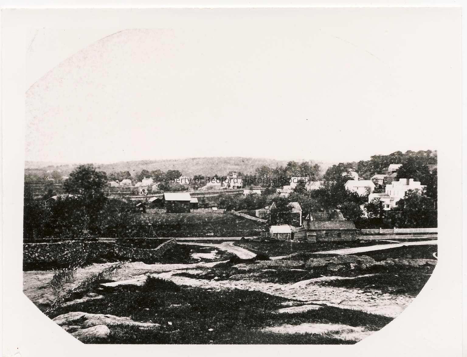View of Bedford Village as seen from "Presbyterian Hill" at junction of Guard HIll road & road to Bedford Station (South of Golf Course) in 1867. Court House may be seen in distance.
