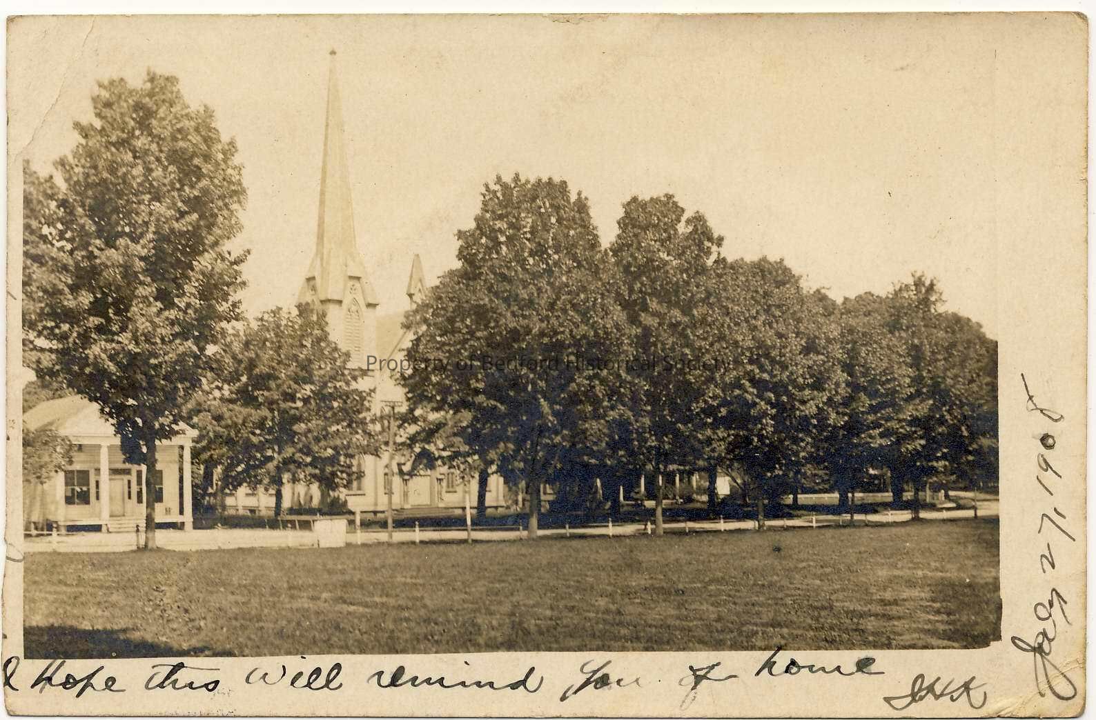 Postcard of Village Green, addressed to Miss J.M. Williamson of Oneonta, NY from "JHK" (John Henry Kinkel?) Written: I hope this will remind you of home- JHK.